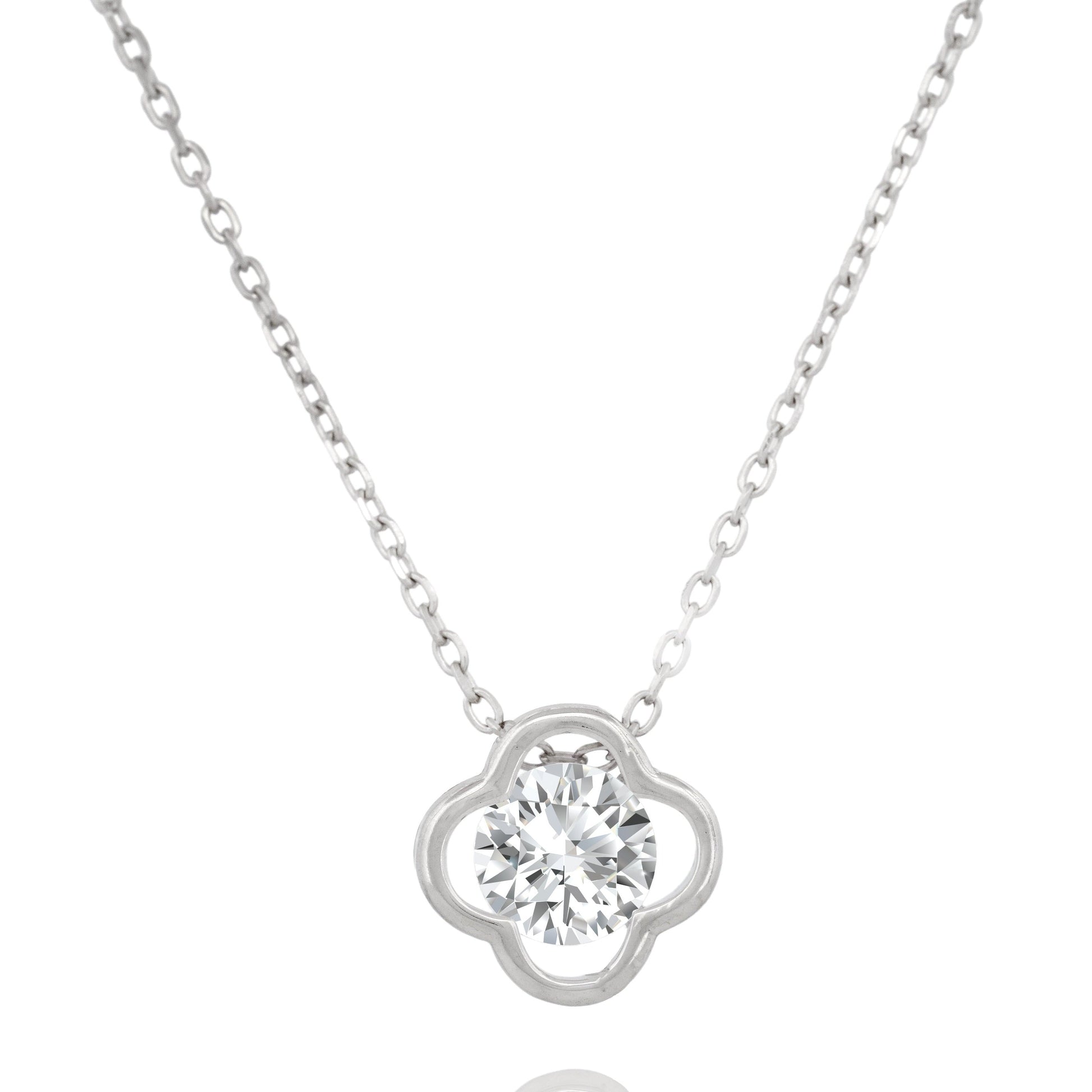 Discover the timeless elegance of our Silver Four-Lobed Shape Pendant Necklace. Expertly crafted with silver rhodium plating for anti-tarnish protection, the 18 inch chain showcases sparkling cubic zirconia stones for a touch of glamour. Elevate any look with this stunning and enduring piece.