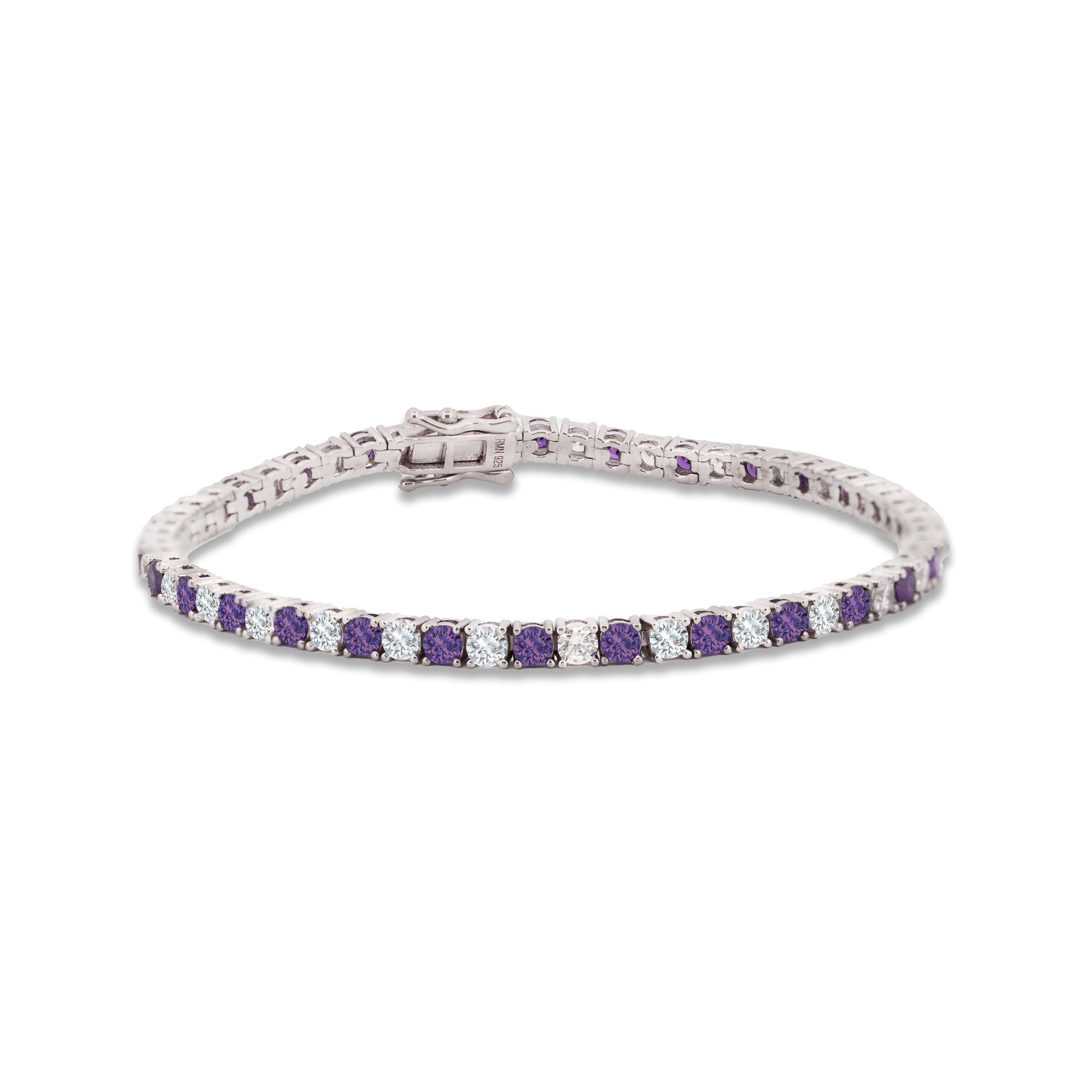 This elegant tennis bracelet features alternating purple and clear cubic zirconia stones, each measuring 3mm and set in a classic four-prong setting. The vibrant purple stones add a touch of color and sophistication, while the clear stones provide a dazzling sparkle. Crafted from high-quality sterling silver 925, this bracelet is designed for lasting beauty. The rhodium plating enhances the silver's shine and provides a protective layer against tarnish. With a length of 7.5 inches, it's a comfortable and stylish accessory for many wrist sizes. Made in Italy, this bracelet showcases fine craftsmanship and timeless appeal.